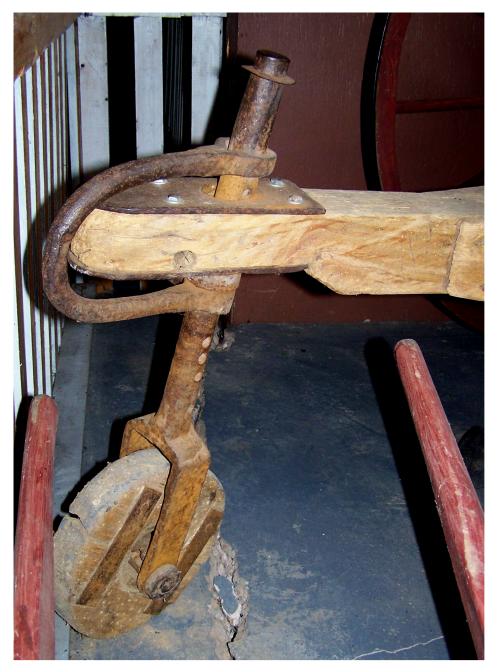 The small wheel appears to have suffered damage and was strengthened with straps of steel. Or perhaps the steel was on from the beginning because of the rough terrain it was meant to be used upon.