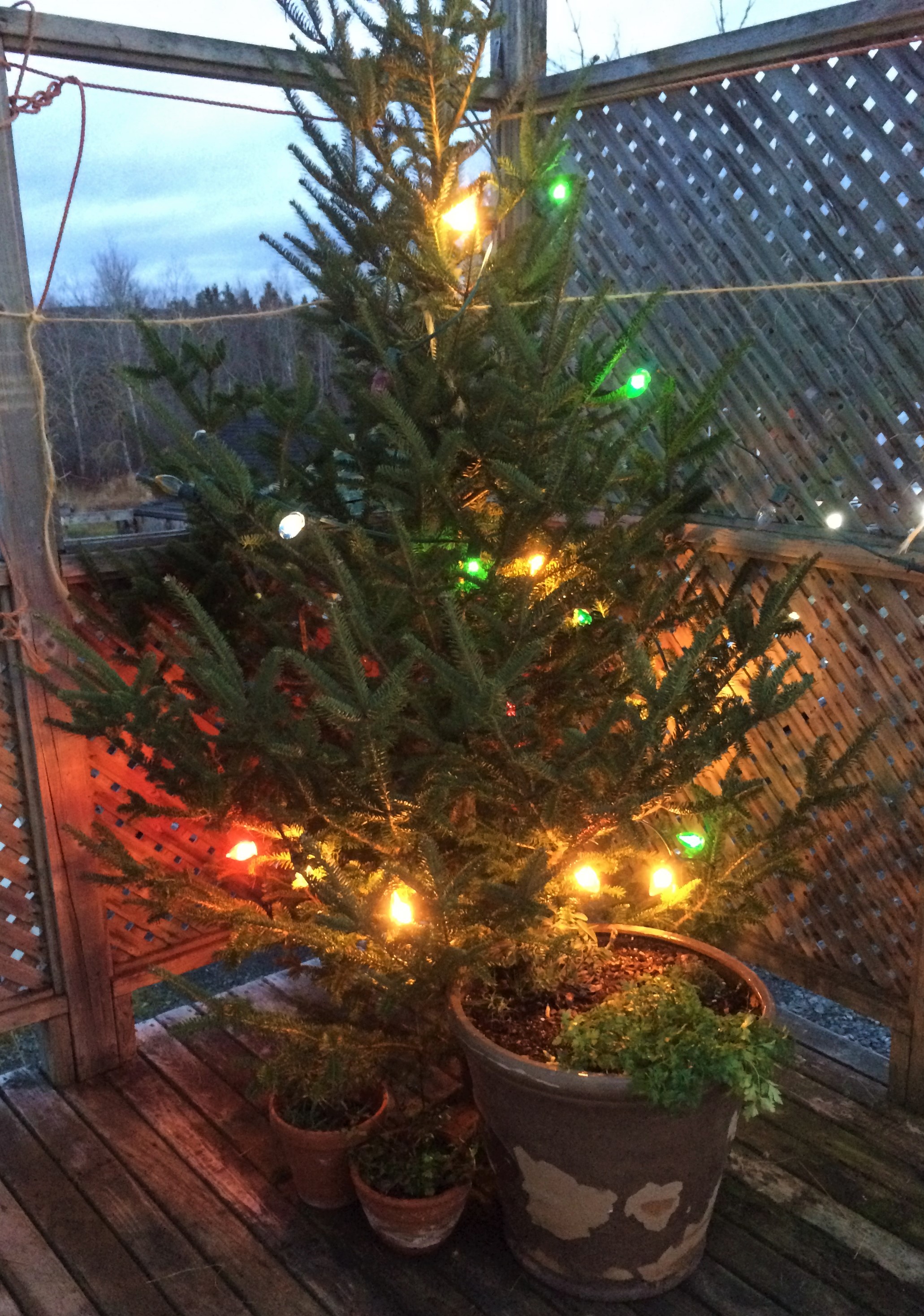 My son said he understood, and then he came home with a spruce. It was truly a beautiful tree, and I didn’t want to throw it away or squash his good intentions, so I put it on the deck and adjusted the lights to go onto the tree. Now we have a lovely lit tree to greet us at our door.