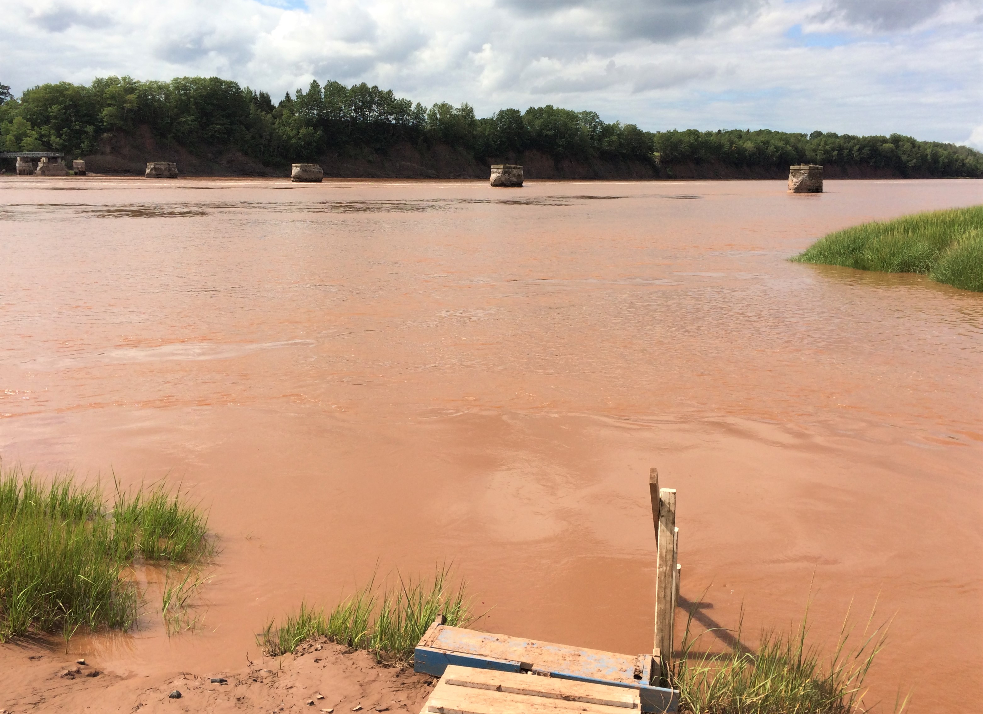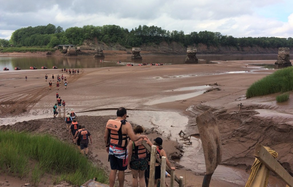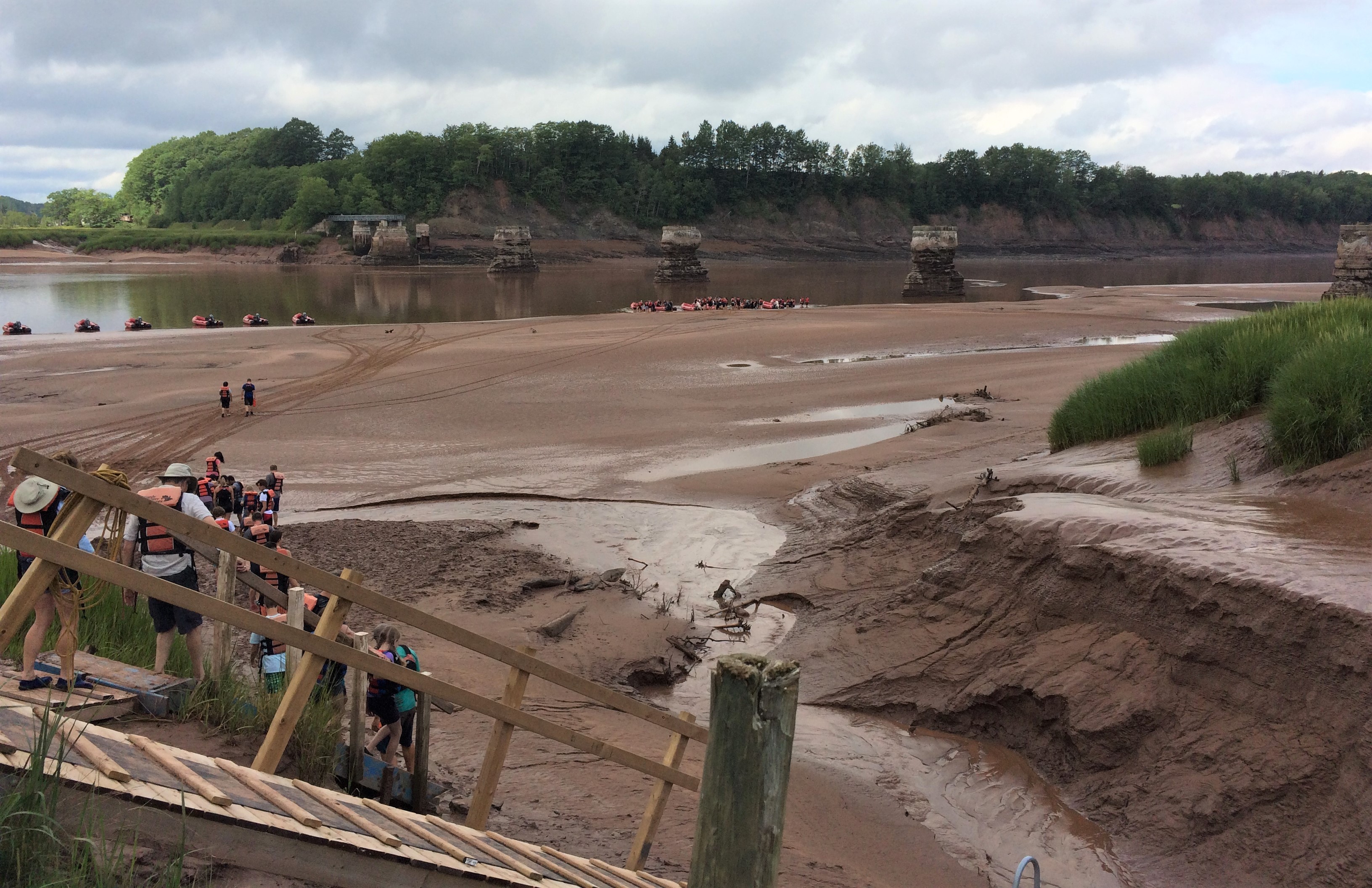 We entered the Shubenacadie River beneath the Maitland Bridge on the 236 Highway. The old pillars of a long-gone bridge added to the scenery. Heading towards the mouth of the river and Cobequid Bay, the overcast day produced a slight breeze. It was warm, low 20s, and humid. A perfect day to be on the water. Ten or 12 boats made the trek and were soon joined by boats from other rafting companies. Guessing, I’d say there were 20 to 25 boats on the water. It was about six miles to our destination to the jut of sand we were to wait on for the tide. Along the way, we stopped to mud slide in the red mud.