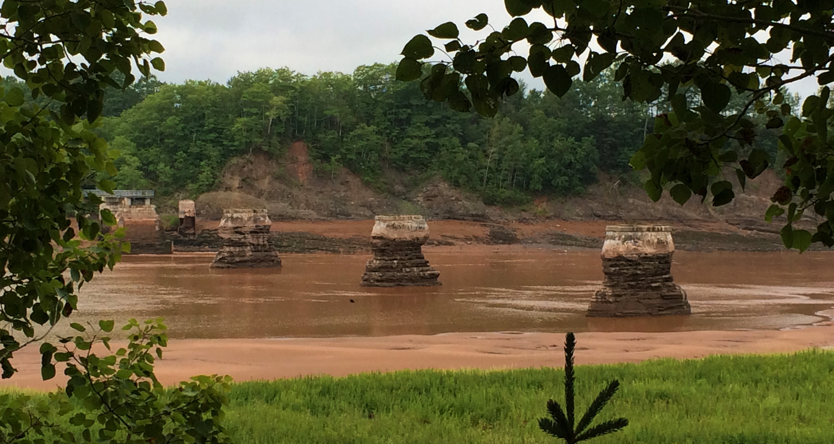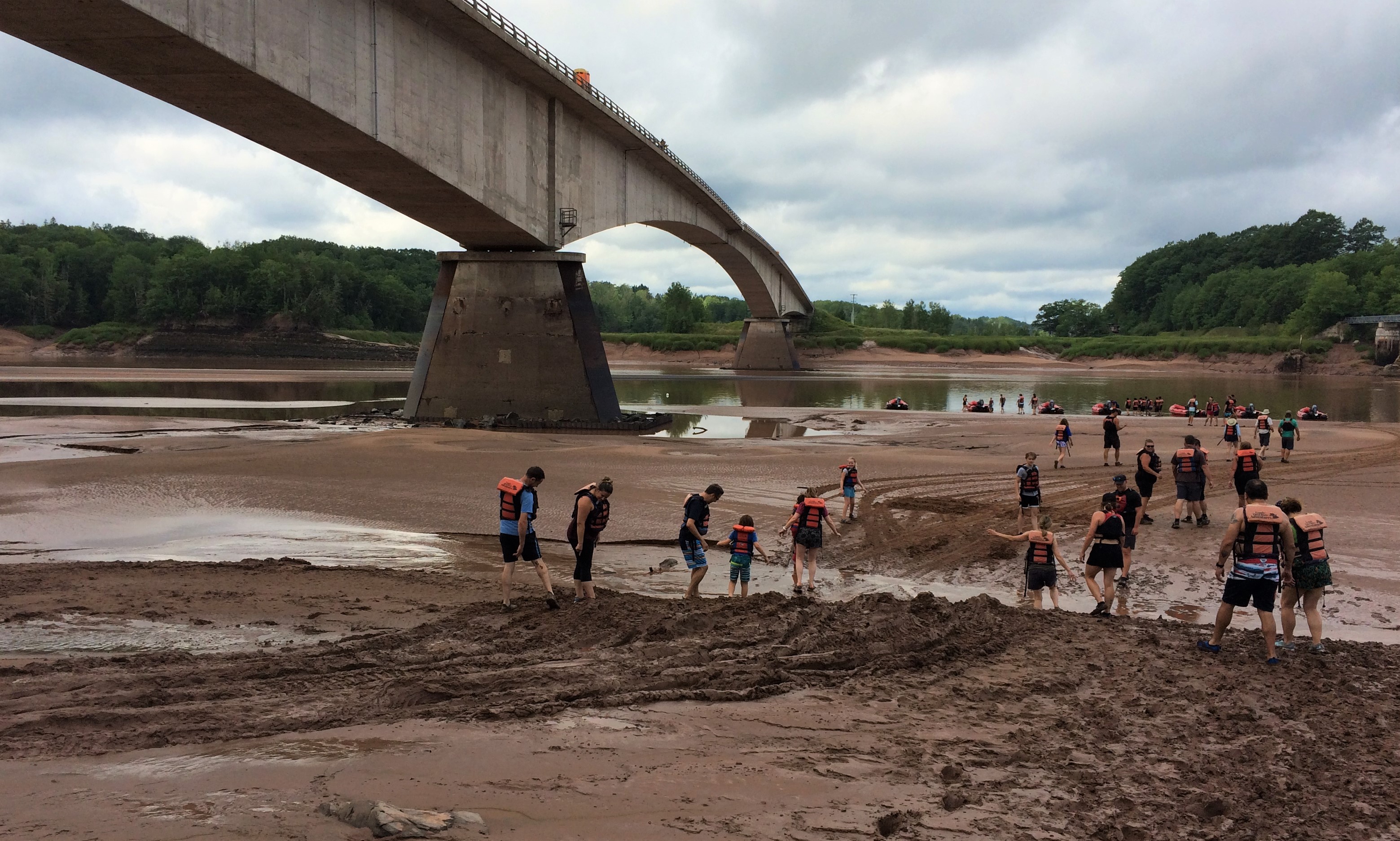 We entered the Shubenacadie River beneath the Maitland Bridge on the 236 Highway. The old pillars of a long-gone bridge added to the scenery. Heading towards the mouth of the river and Cobequid Bay, the overcast day produced a slight breeze. It was warm, low 20s, and humid. A perfect day to be on the water. Ten or 12 boats made the trek and were soon joined by boats from other rafting companies. Guessing, I’d say there were 20 to 25 boats on the water. It was about six miles to our destination to the jut of sand we were to wait on for the tide. Along the way, we stopped to mud slide in the red mud.