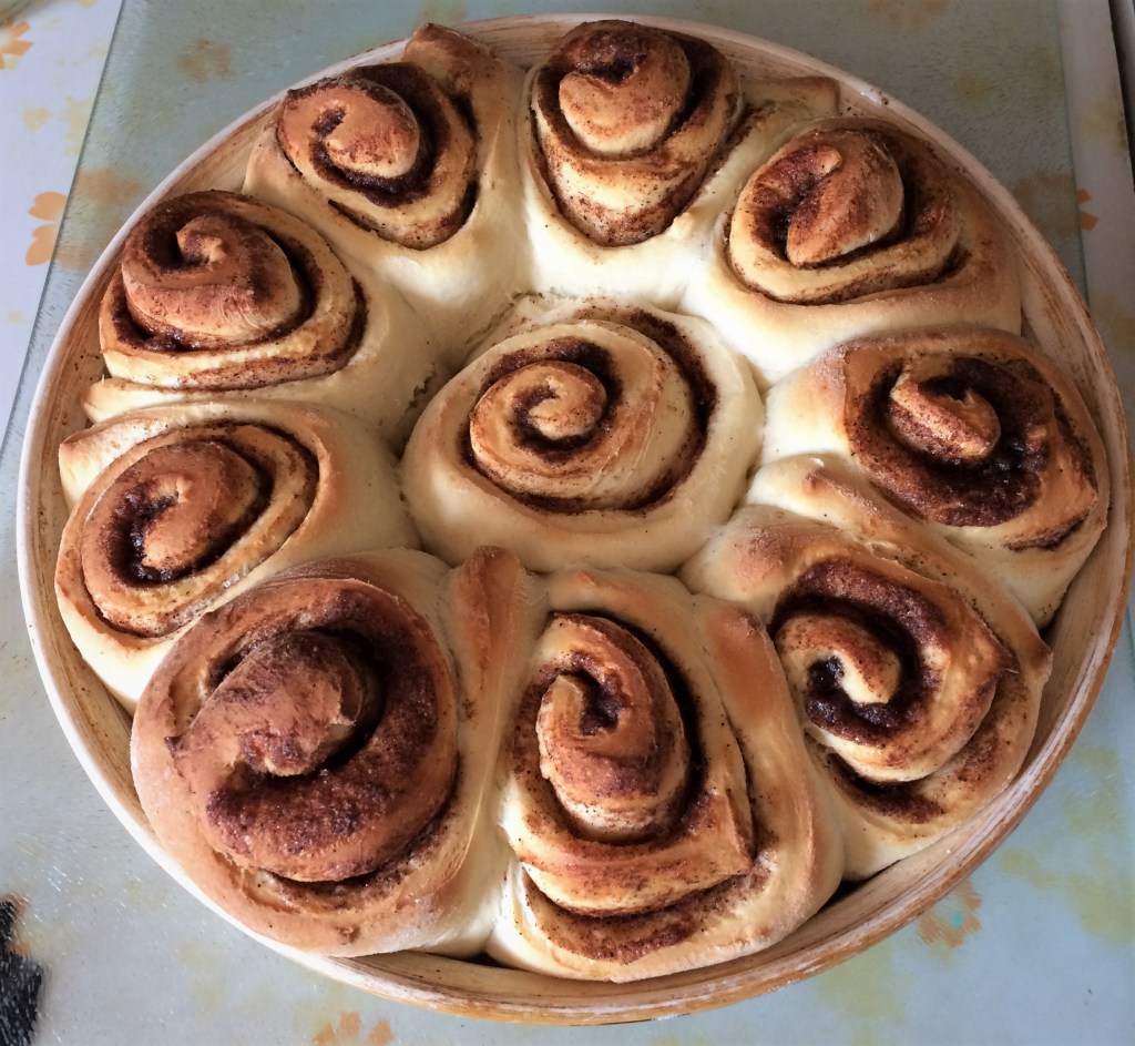 Step 10: Spread the soft margarine over the surface of the dough, then sprinkle about half the cinnamon and brown sugar mixture evenly over the margarine. Roll the dough up to make a ‘tube’. Cut this as equally as you can into 10 pieces. Unless you want larger rolls, then cut less. Set these in the greased pan. I gently spread the rings apart. Not a great deal, but a little to ‘show’ them how they will expand. Repeat this step with the other half of the dough in the bowl. Now you have two pans of buns. Or one large pan or… however you panned them.
