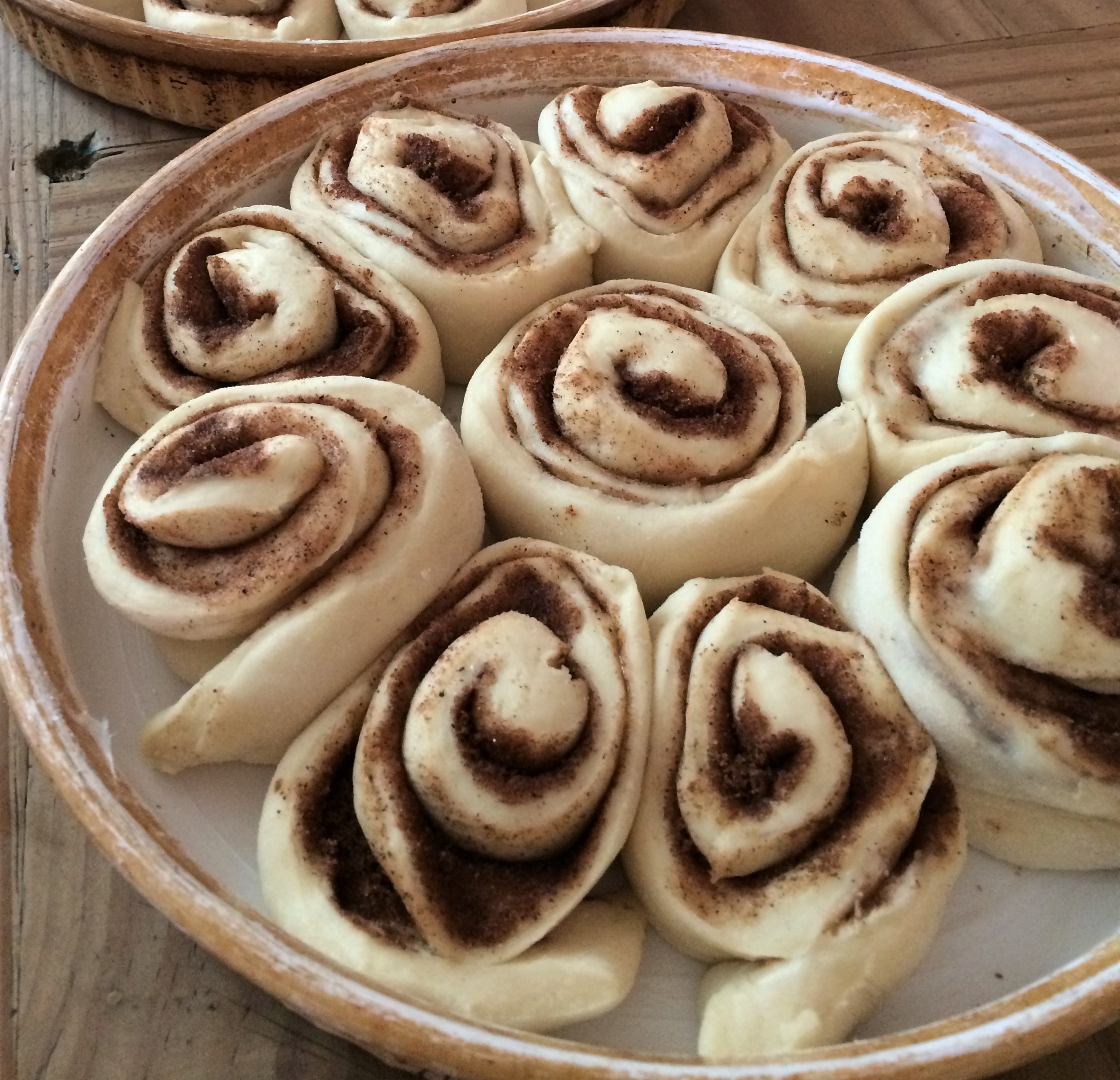 PANS: Use what you have. I have 2 x 9 inch ceramic pans. I have made these cinnamon rolls in steel pans, too, but I like using ceramic and that’s what we got 25 years ago when we moved into the house. But any pan will do as long as it has a lip of at least 1 inch and is large enough to accommodate the rising dough. I suppose a pizza pan would do, if that’s all you had.