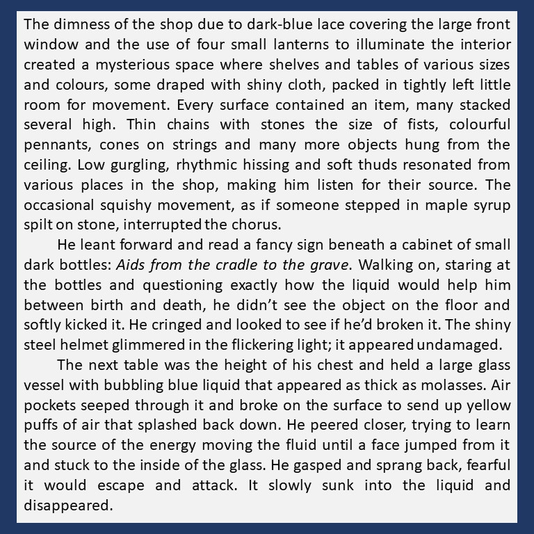 Mystical Paragons is an unusual shop inspired by one I entered almost two decades ago in Digby, Nova Scotia. The atmosphere in the little shop by the waterfront was dimly lit, had brightly-coloured items and unusual things I had never seen before.